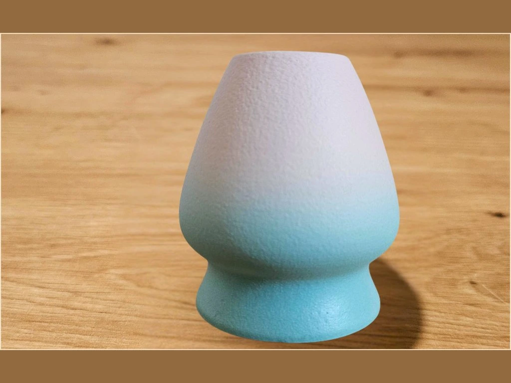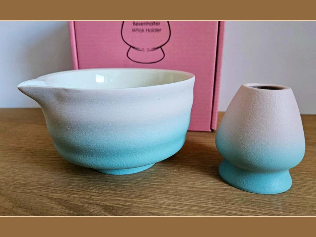 Základní set pro matcha rituál. Keramický chawan s nalévacím zobáčkem a holder pro bambusovou metličku v odstínu Harmony (modro-jemně růžová barevná kombinace).